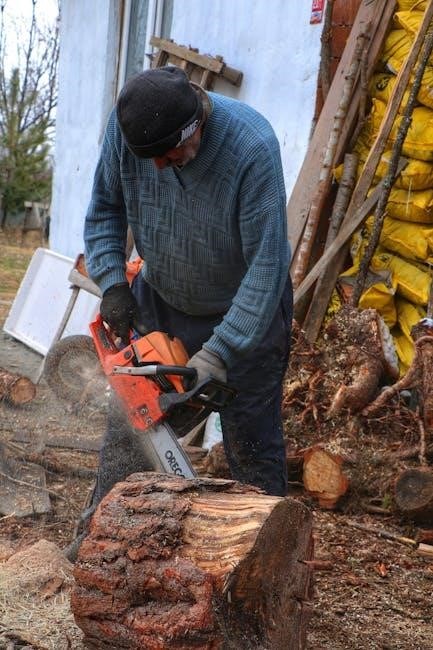 Before starting, ensure the work area is clear and level. Connect the log splitter to a suitable power source, following the instructions in the ‘Connecting to a Power Source’ section. Always wear appropriate safety gear, including eye protection and gloves. Start the engine and allow it to warm up briefly.
